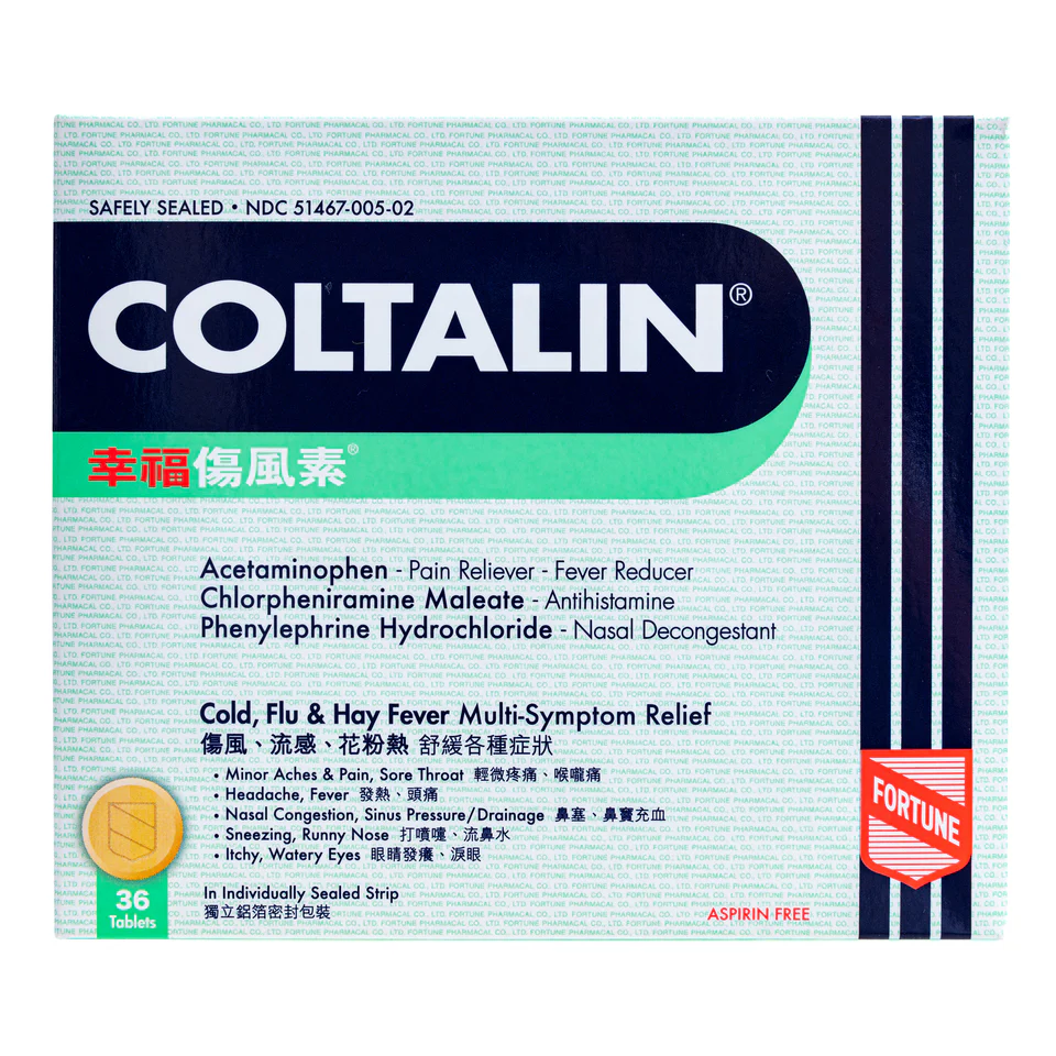 Fortune Coltalin Cold Tablets are one of the most trusted remedies in Hong Kong and Asia for easing cold and flu discomfort. Each tablet combines an antihistamine, nasal decongestant, and fever reducer to temporarily relieve the symptoms of the common cold, hay fever, and seasonal allergies.
